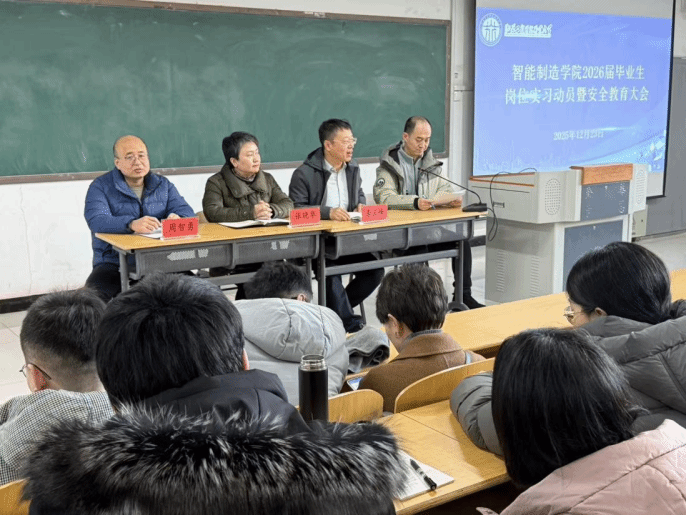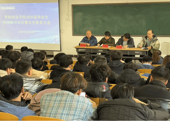 为切实做好2026届专科毕业生岗位实习工作,进一步强化毕业生实习安全意识,明确实习工作要求,智能制造学院于2025年12月23日召开2026届专科毕业生岗位实习动员暨安全教育大会。学院党委副书记(主持工作)张晓华、副院长(主持工作)李云峰、副院长周智勇,2026届专科毕业班全体实习指导教师、辅导员参加会议,会议由学院教产研办公室主任杨文刚主持。