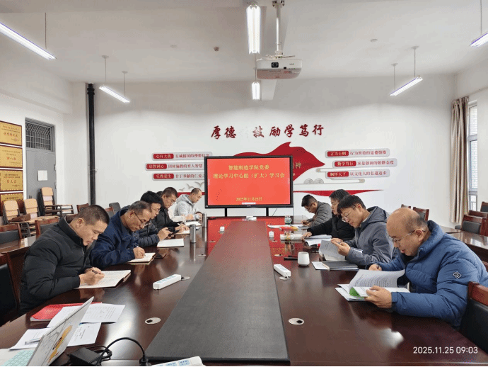 11月25日上午,智能制造学院召开党委理论学习中心组(扩大)学习会,学习宣传贯彻党的二十届四中全会精神。学院党委副书记(主持工作)张晓华主持会议,学院党委委员、三办两系一中心负责人、各党支部书记、专职组织员参加学习。